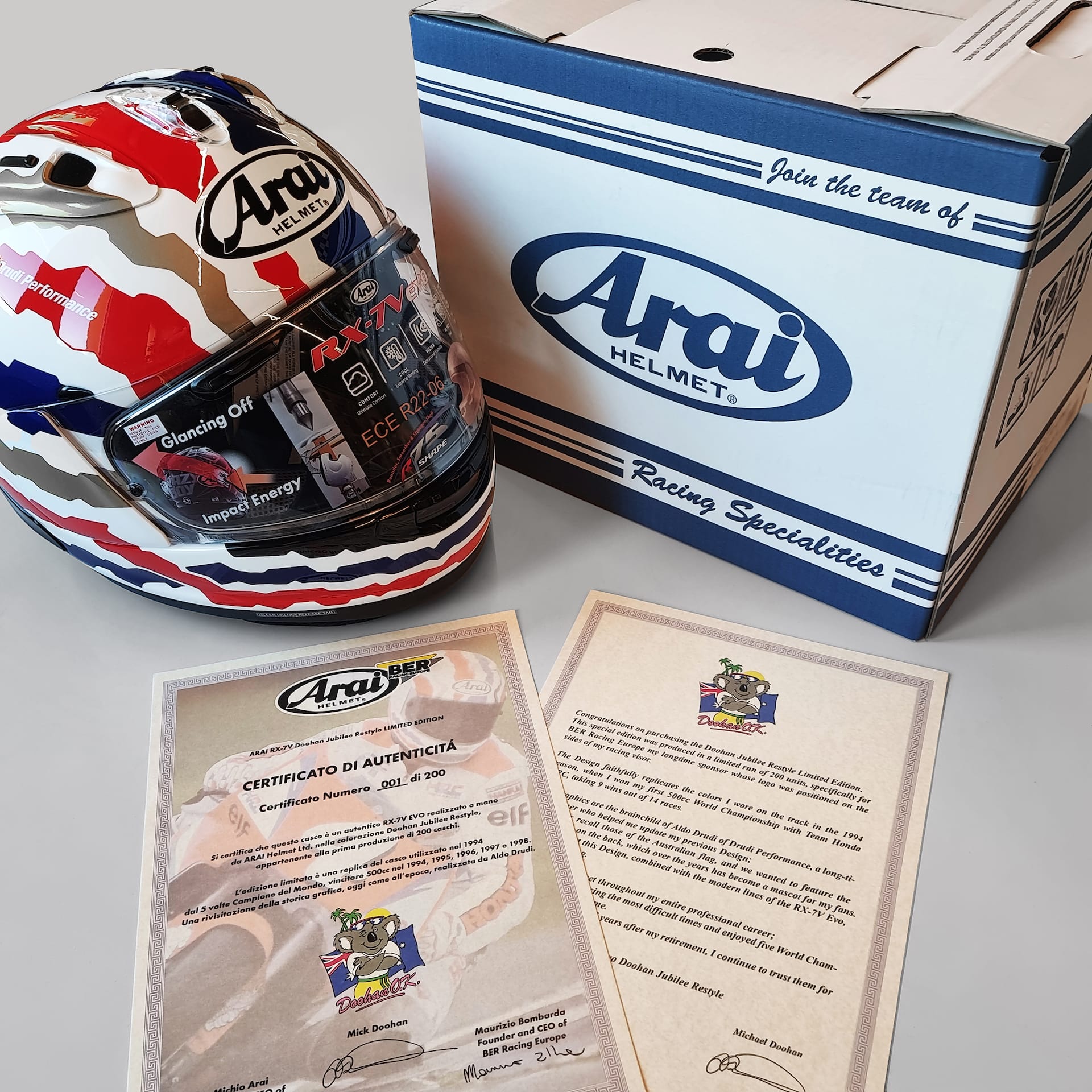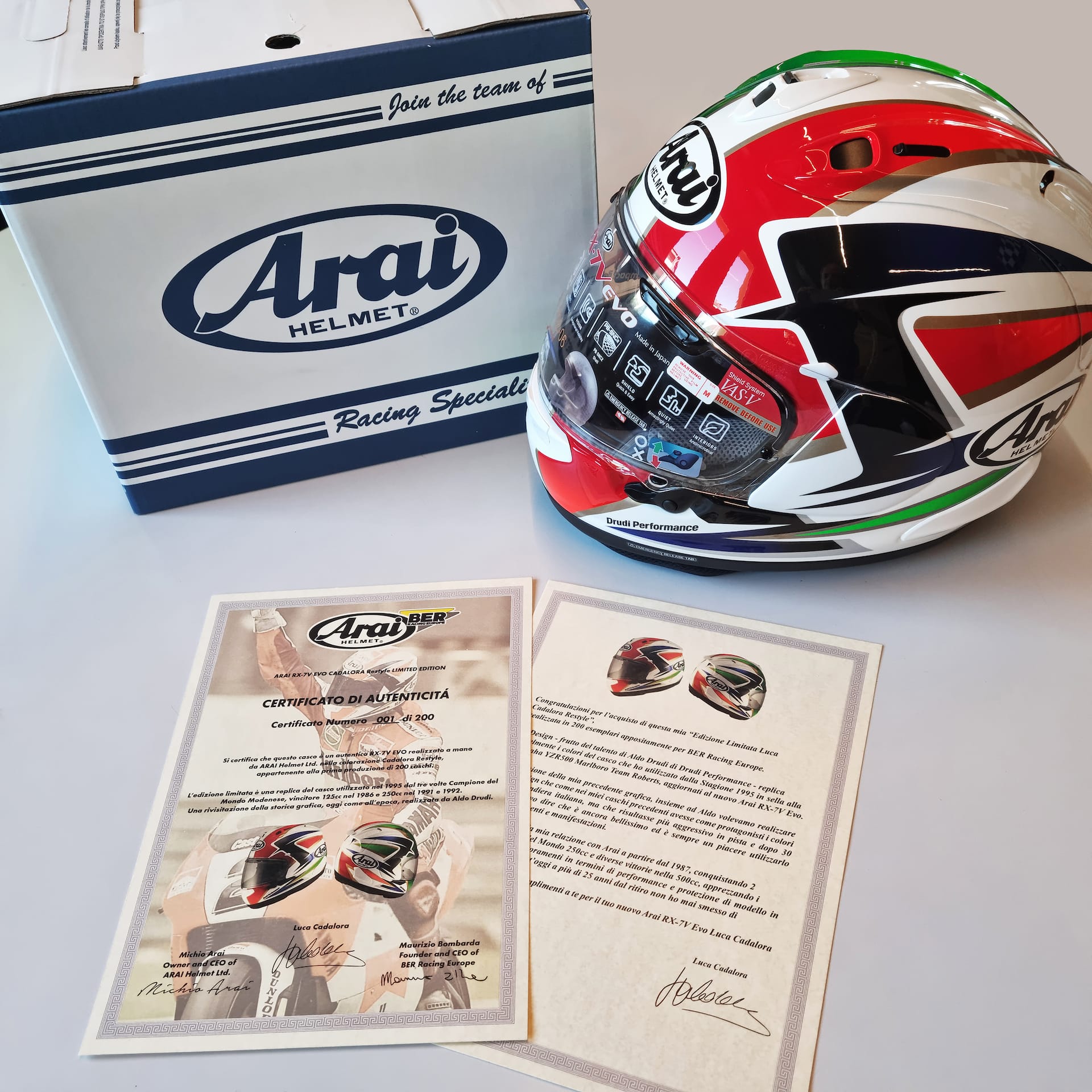 In over 70 years of history thousands of riders have chosen to entrust their safety to Arai. With the aim of celebrating some of their achievements, Arai and BER Racing Europe showcase the Arai Legend Series Limited Edition, a series of designs brought to the track by some of the most beloved champions by fans around the world. The Arai Legend Series 2025 in this case are offered on the top-of-the-range RX-7V Evo model. There are two versions: “Doohan Jubilee Restyle”, the version used by “The Cannibal” in 1994 riding the Honda NSR500, and “Luca Cadalora Restyle”, the design chosen in 1995 by the three-time World Champion from Modena riding the Marlboro Team Roberts Yamaha. The first 200 units of each version will be embellished with a numbered Certificate of authenticity, signed by the rider, Michio Arai (president of Arai Helmet), and Maurizio Bombarda (president of BER RacingEurope).