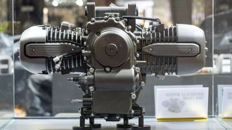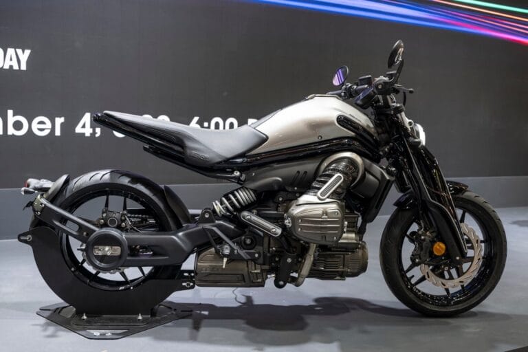 At Booth A54 (Hall 18) Benda showcases the Dark Flag 950, Rock 707, and Rock 250 CVT cruisers. The Dark Flag 950 is equipped with a 948 cc twin-cam V4 engine delivering 108 hp and 85 Nm. When maximum performance is not required, two cylinders are deactivated. It is equipped with a slipper clutch, belt final drive, ABS, and disengageable traction control. The Rock 707 uses a 691 cc V-twin engine with 73.4 hp and 68 Nm, combined with an electro-assisted clutch for quick gear changes without a lever, and belt final drive. The electronic pneumatic rear suspension allows you to adjust the set-up and height (seat height 690-720 mm from the ground). The Rock 250 CVT is designed for easy riding. It is equipped with a 249 cc V2 engine with 25.8 hp and 25 Nm with automatic CVT transmission. However, it is the P51 concept to catch the attention of the visitors, and not just for its design: under the tank is a hybrid powertrain with a 250 cc twin-cylinder boxer engine combined with an electric motor. In total, it develops 62 hp, with a torque of 100 Nm. It is possible to exploit the thrust of the electric and thermal parts simultaneously, or to delegate traction to the combustion engine. The platform on which the P51 is built is modular, and the production model is expected shortly.