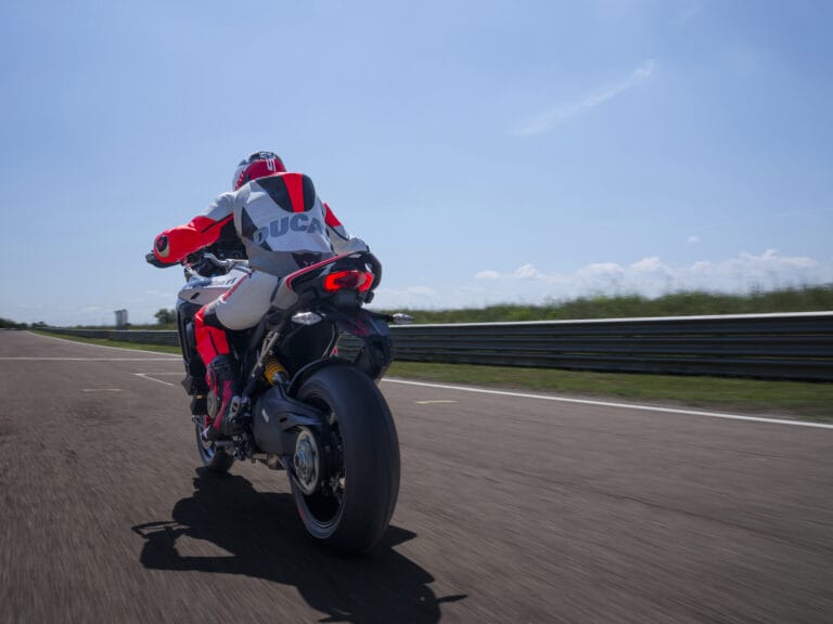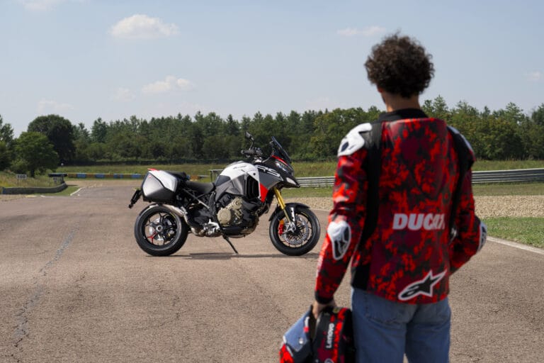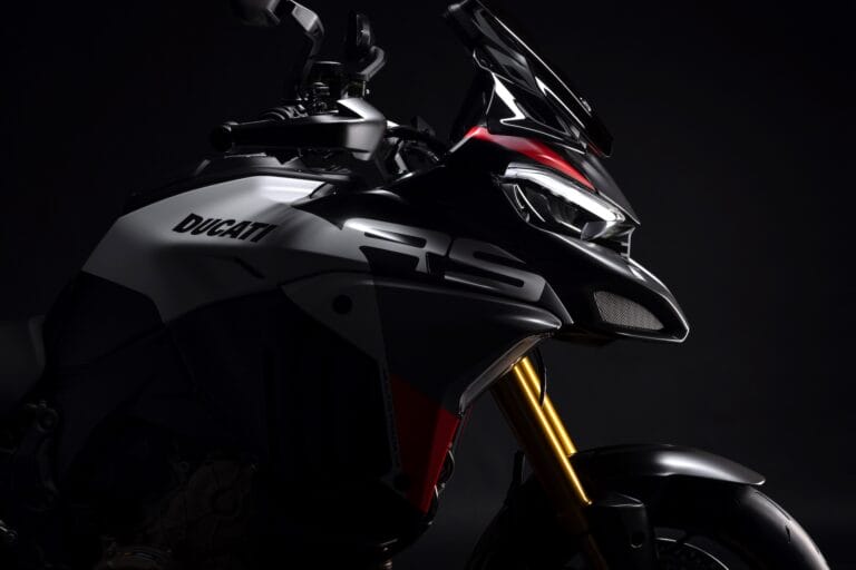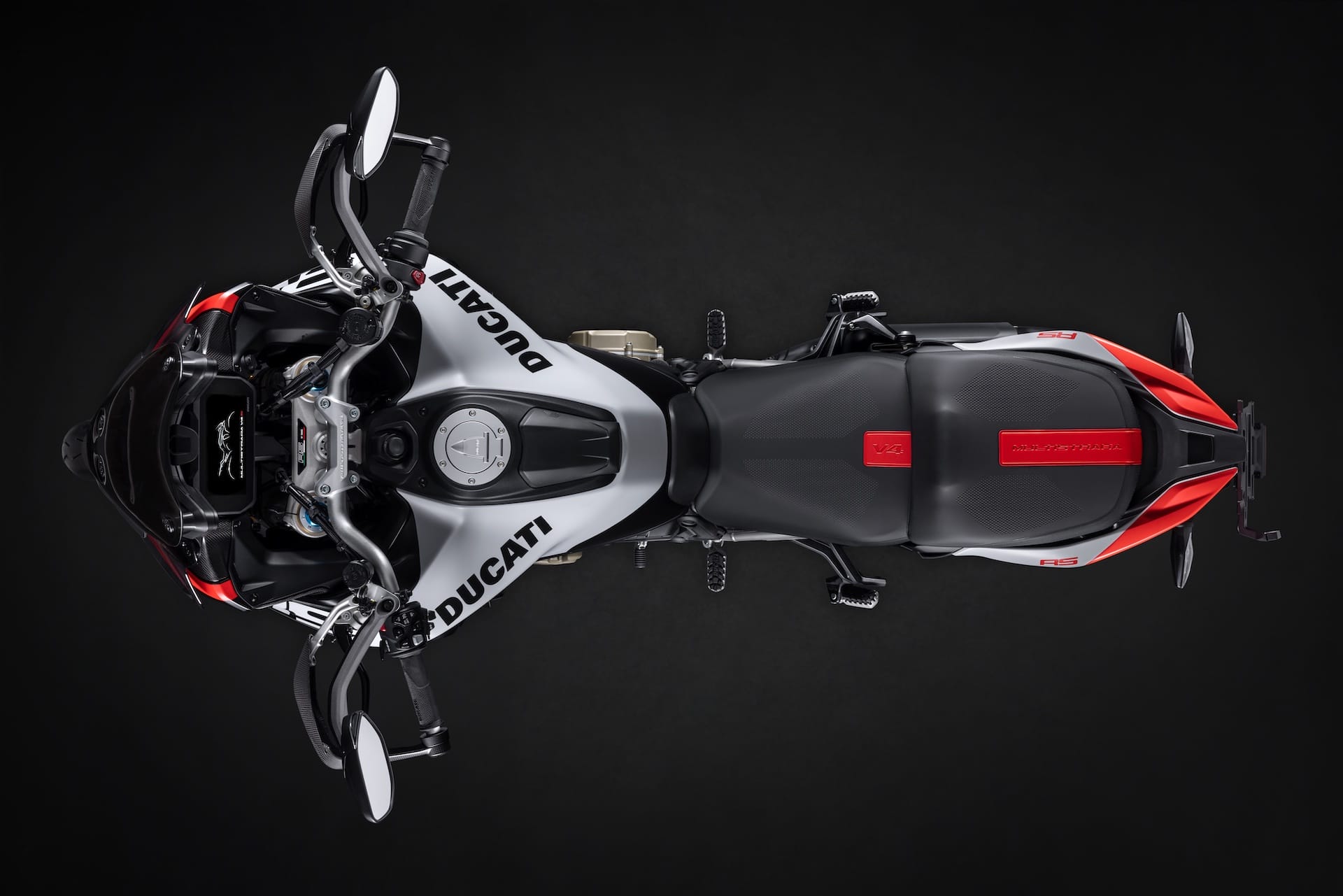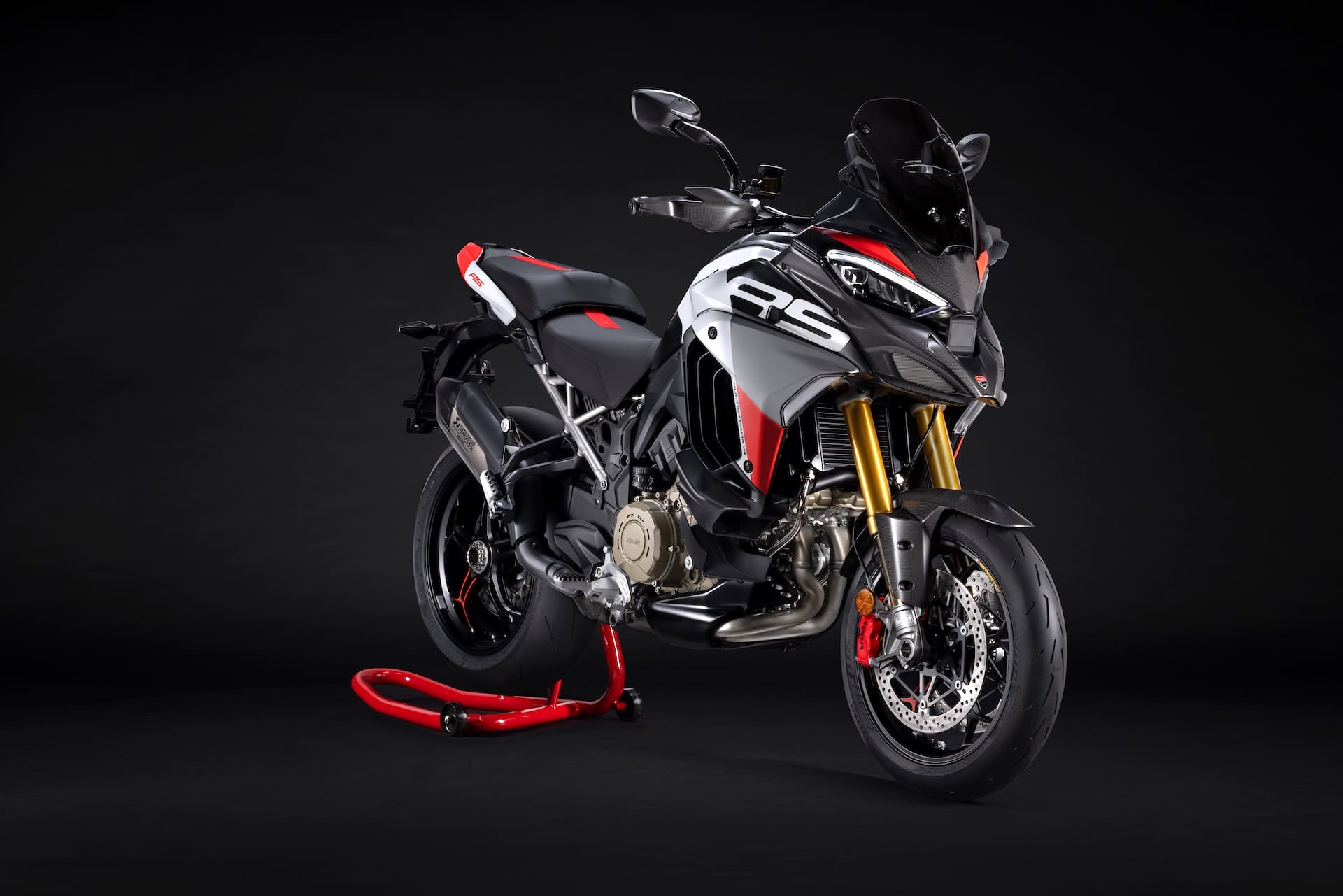 Ducati presenta a EICMA 2025 la nuova Multistrada V4 RS, versione sportiva che colpisce con una livrea inedita. Stile a parte la posizione di guida propone un manubrio ribassato e pedane più alte e arretrate. Cuore di questa moto è il noto quattro cilindri a V di 90°, che qui eroga 180 CV e ha una rapportatura finale accorciata. I riding mode sono invece 5, con la nuova modalità Race che si somma a Sport, Touring, Urban e Wet. La dotazione include il cruscotto TFT da 6,5” con grafica dedicata, Ducati Connect e navigatore. Un altro plus sono i radar anteriore e posteriore che supportano il cruise control adattivo e il monitoraggio dell’angolo cieco. La Multistrada V4 RS contiene il peso con codino in tecnopolimero, elementi in fibra di carbonio e la batteria più compatta, oltre a un esclusivo telaietto reggisella in titanio che pesa 2,5 kg meno di quello standard. Il telaio monoscocca in alluminio ha quote riviste e un cannotto con angolo più chiuso. Completano il quadro le sospensioni elettroniche Öhlins Smart EC 2.0, le ruote da 17” Marchesini in alluminio forgiato e un impianto frenante con dischi da 300 mm e pinze Brembo Stylema.